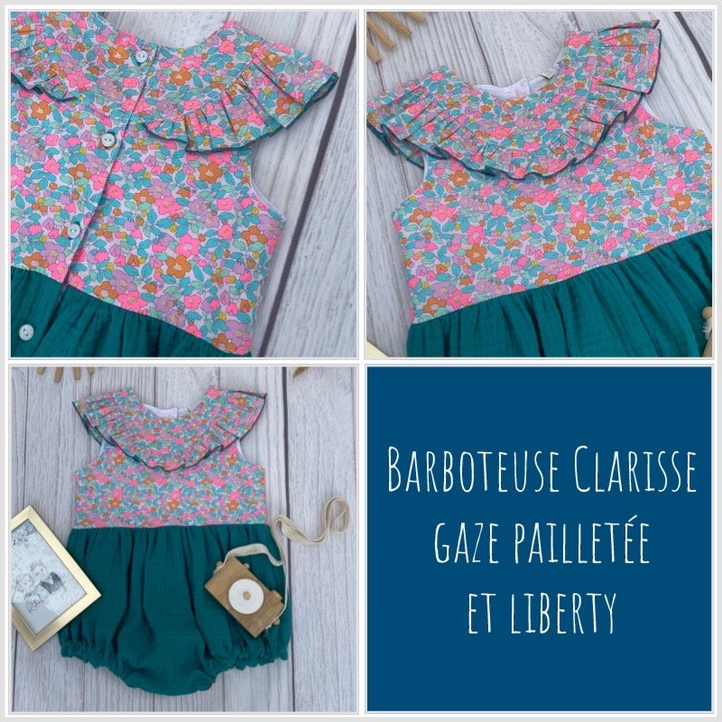 Barboteuse Clarisse gaze pailletée et Liberty Classique