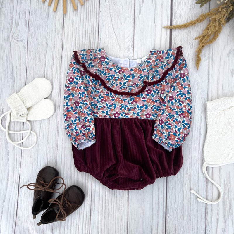 Barboteuse 12 mois velours griotte et liberty betsy berry églantier