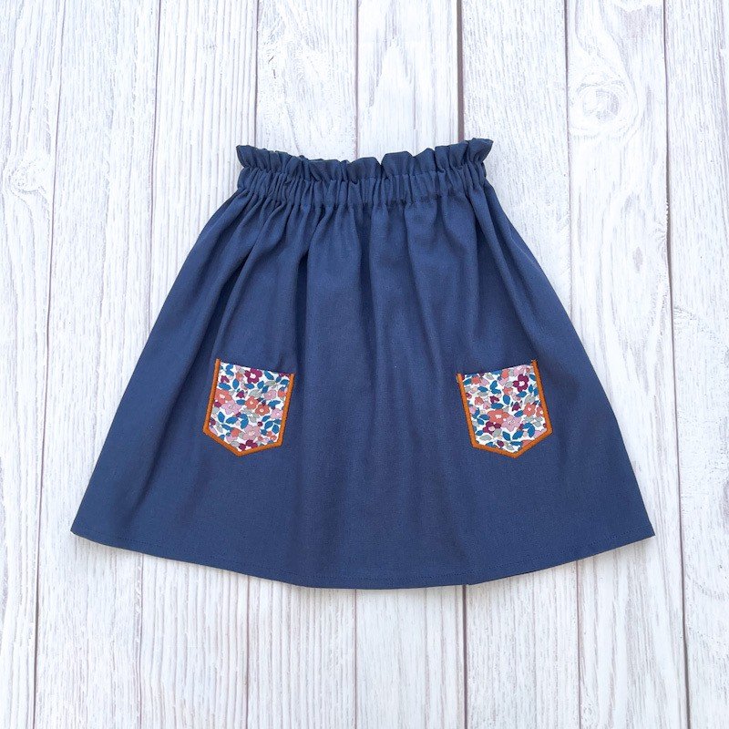 Jupette en lin (40%) et viscose (60%) bleu océan à poches brodées en Liberty Betsy berry églantier