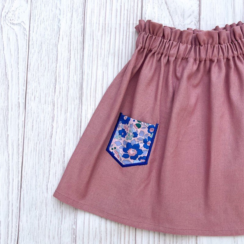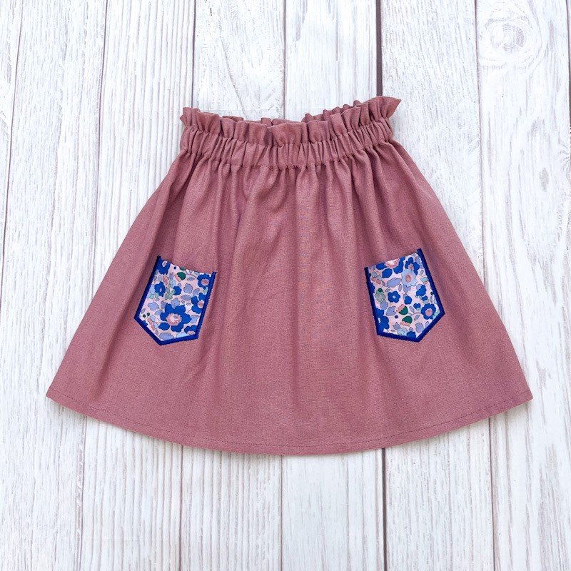 Jupette en lin (40%) et viscose (60%) rose doux à poches brodées en Liberty Betsy cobalt