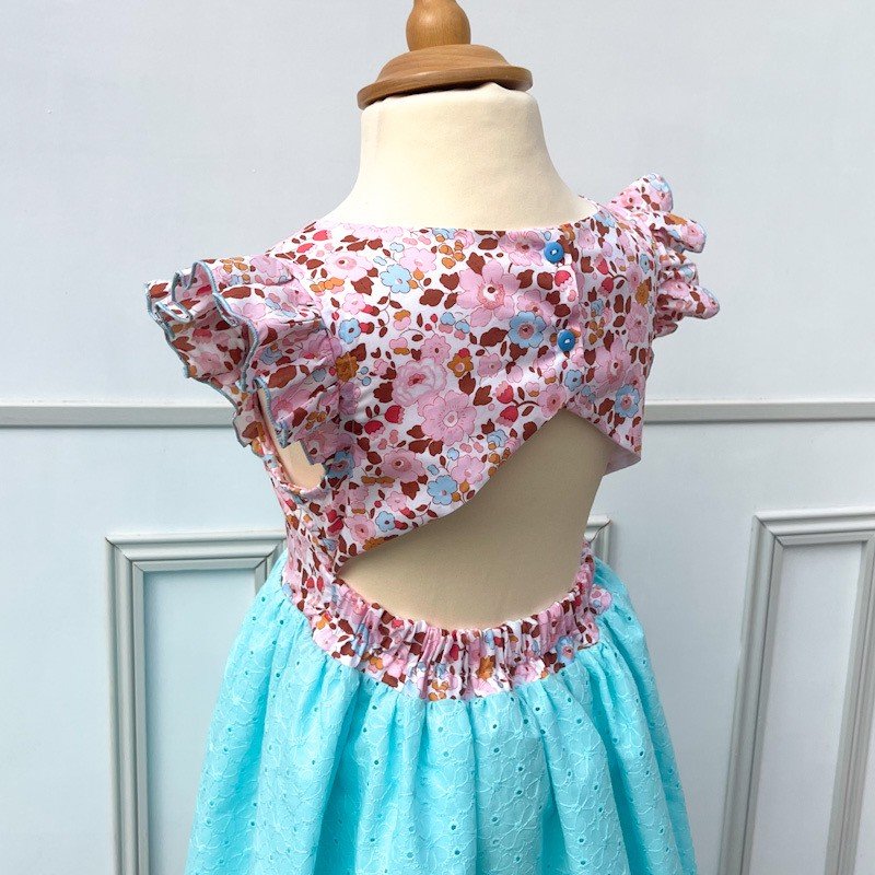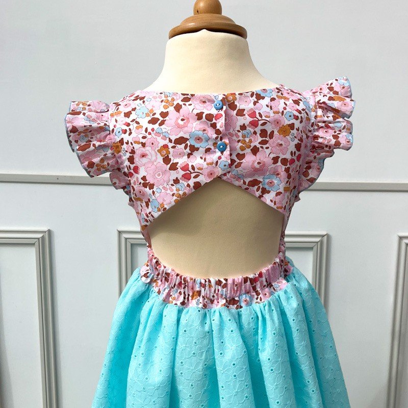 Robe prémium Adèle 6 ans Liberty Betsy écureuil et broderie anglaise festonnée bleu turquoise