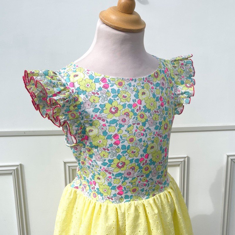 Robe prémium Adèle 8 ans Liberty Betsy sorbet et broderie anglaise festonnée jaune tendre