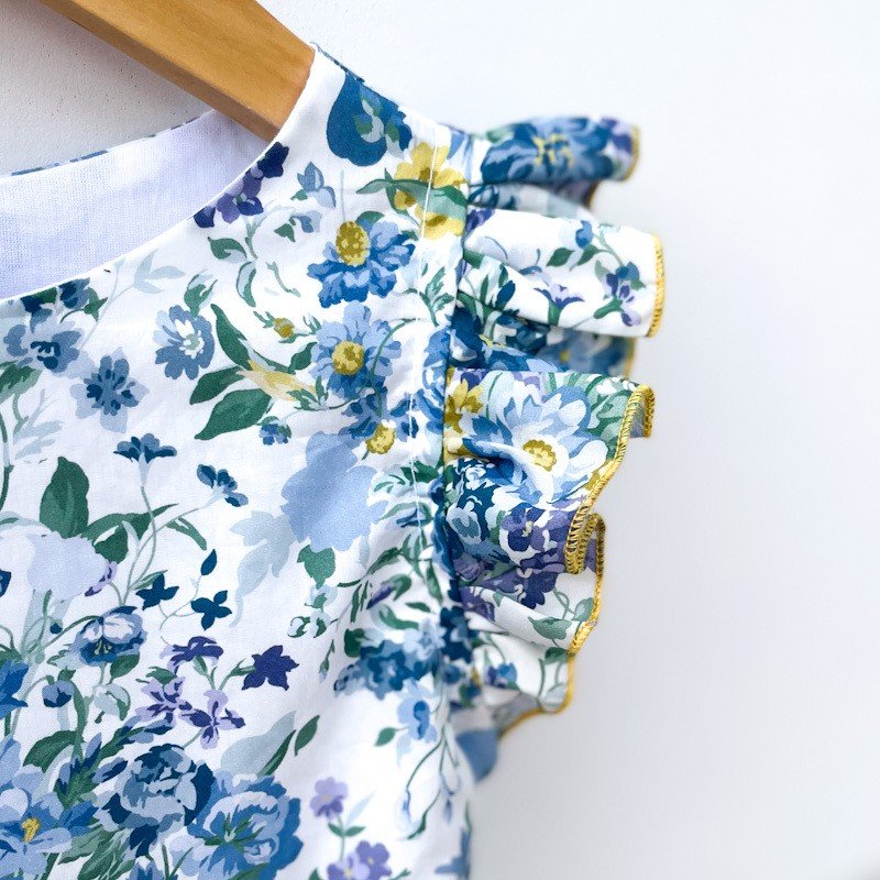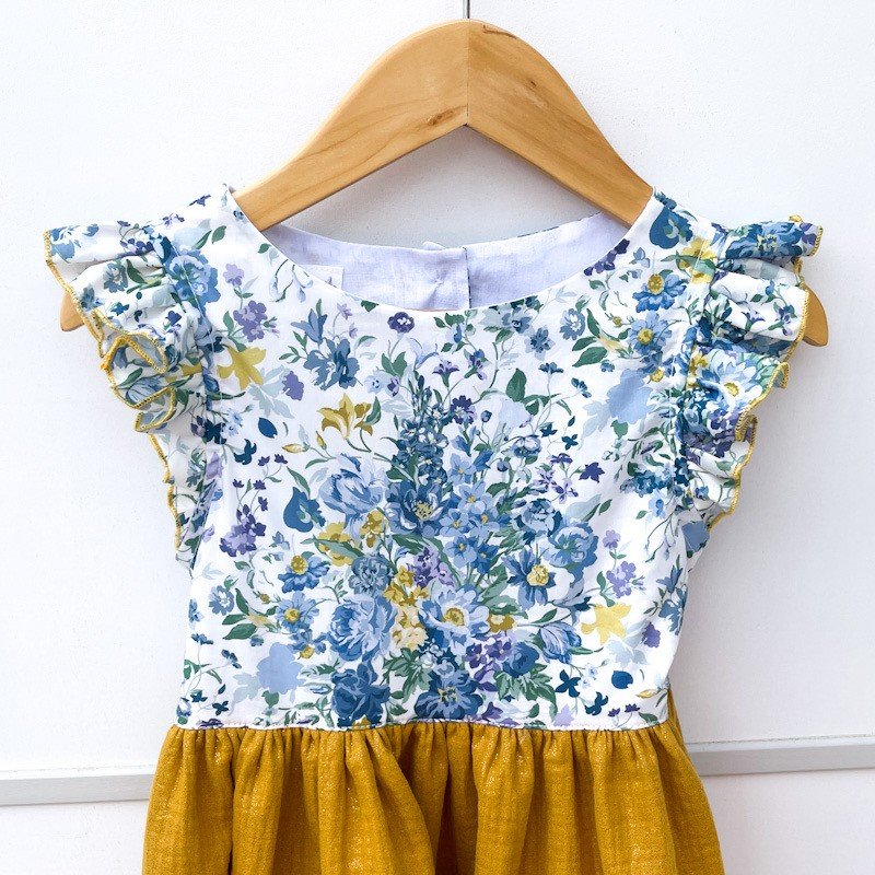 Robe Adele en Liberty bridgerton bouquet parade navy et gaze pailletée moutarde