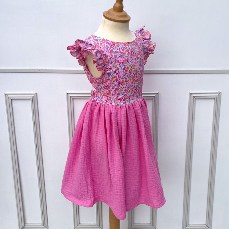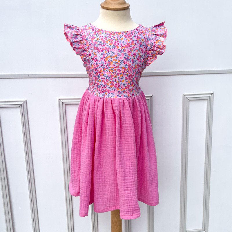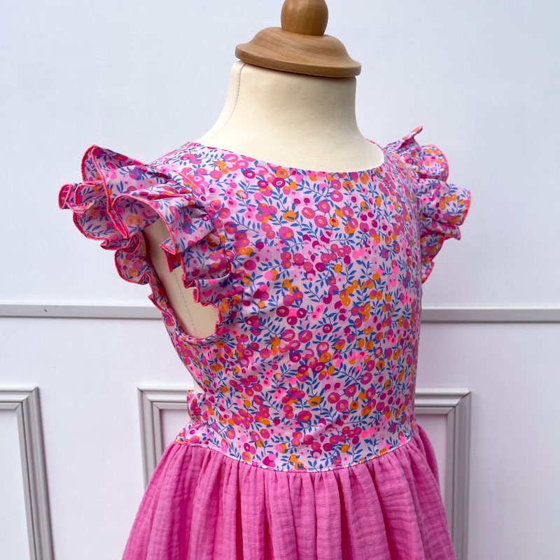 Corsage et manches volantées en liberty of london wiltshire pool party - jupe en gaze de coton rose malabar