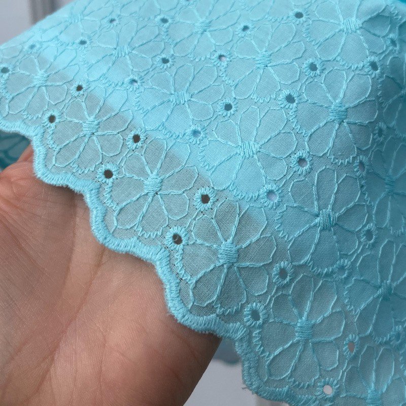 La jupe est en broderie anglaise bleu turquoise avec une finition festonnée sur le bas. Elle est entièrement doublée de voile de coton.
