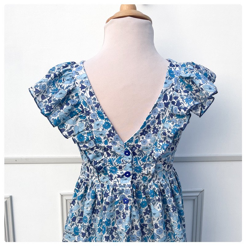 La robe Alba: un adorable dos nu en V, souligné de volants qui se prolongent sur l'avant du corsage.