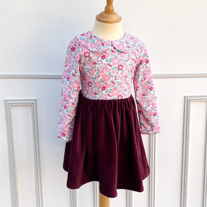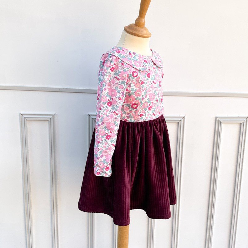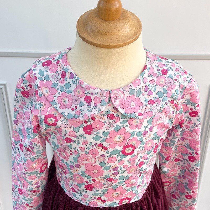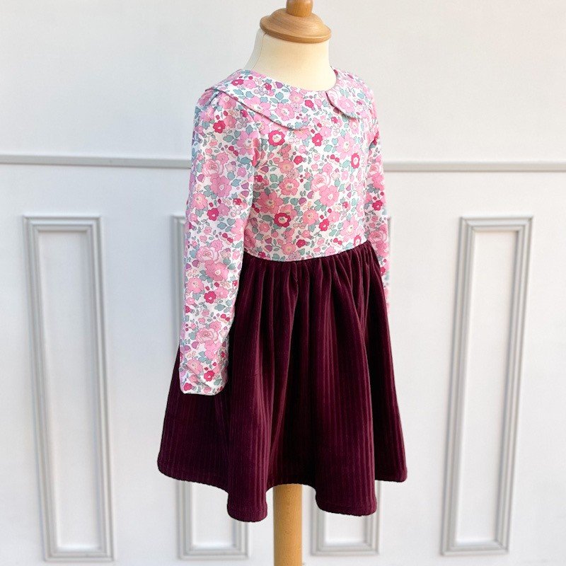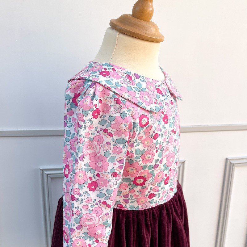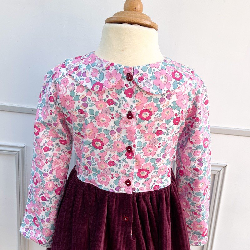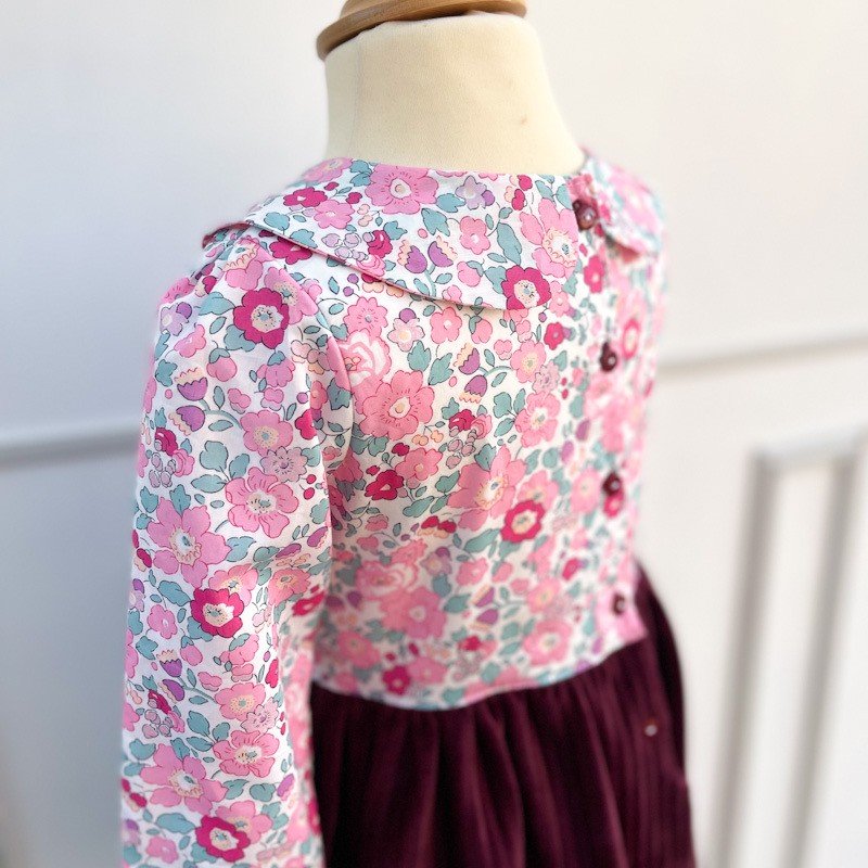 Le corsage est en Liberty tana lawn entièrement doublé de voile de coton. Les manches sont en liberty et la jupe en velours côtelé souple.