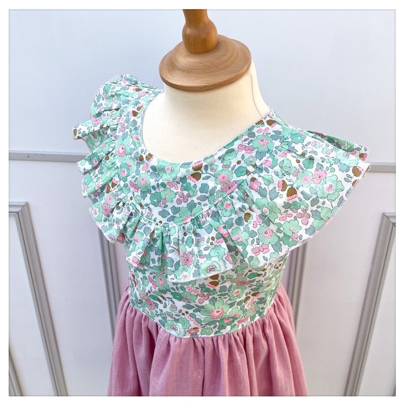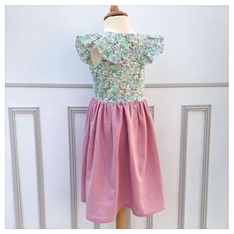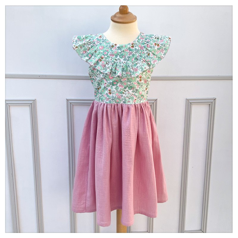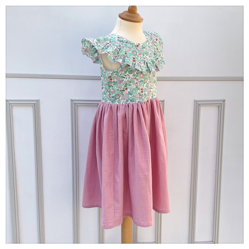 Le corsage ainsi que les manches sont en liberty et la jupe en gaze de coton