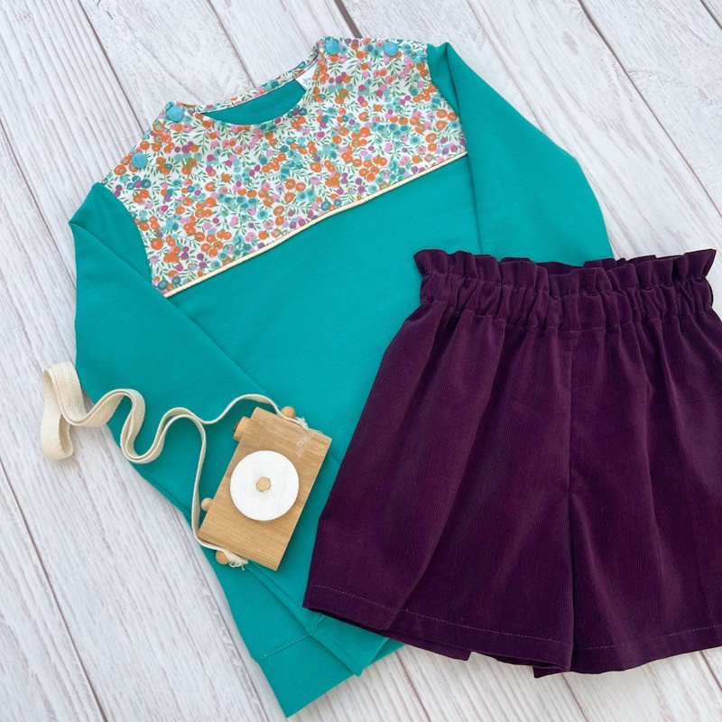 Le sweat se ferme dans le dos par un nœud assorti en liberty ou par un joli bouton au choix pour les formes Claudine et Adriana