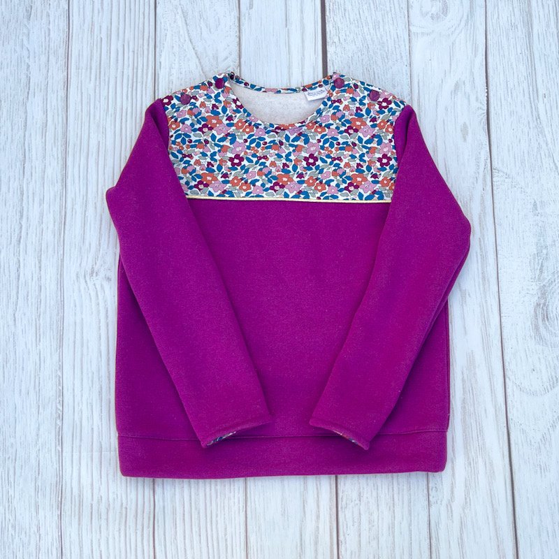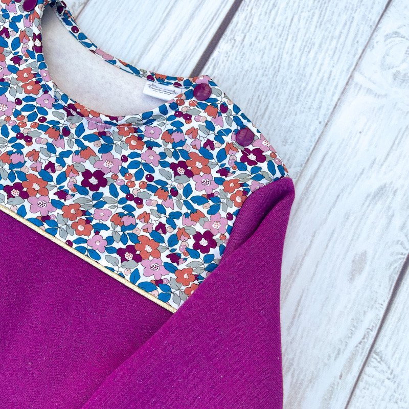 Sweat molletonné magenta pailleté et liberty of London Betsy berry églantier