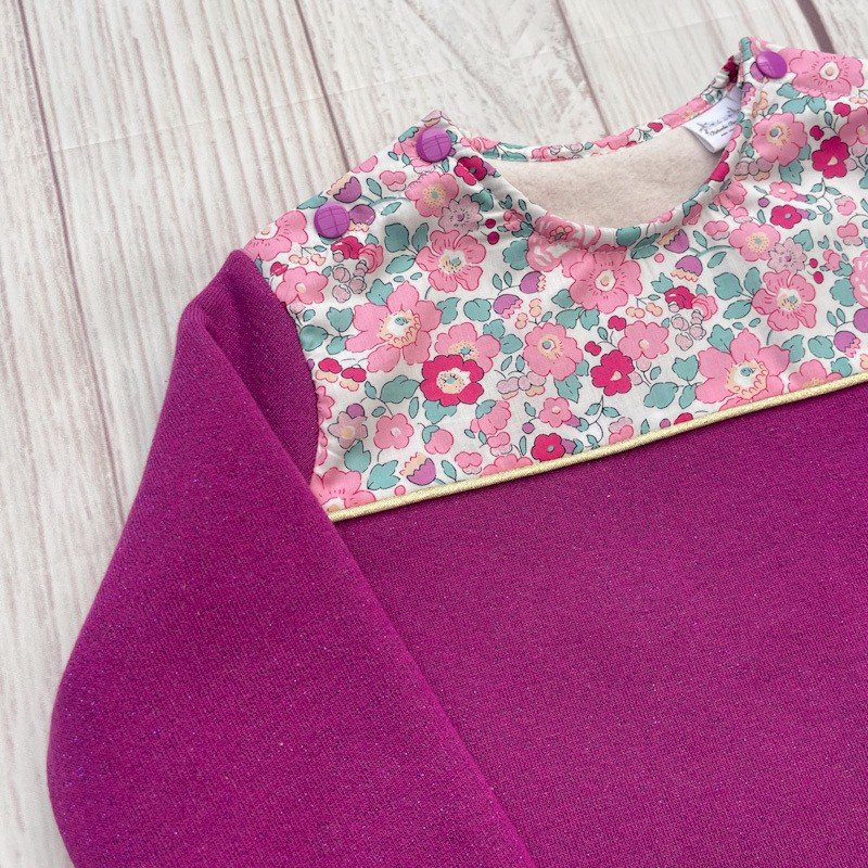 Sweat molletonné magenta pailleté et liberty of London Betsy pétale irisé