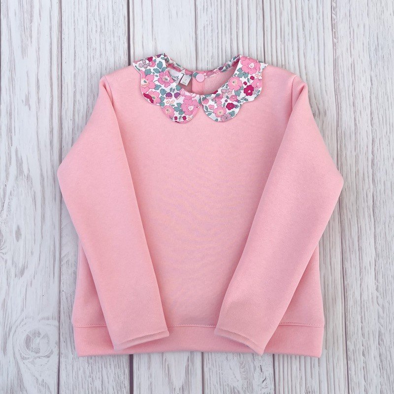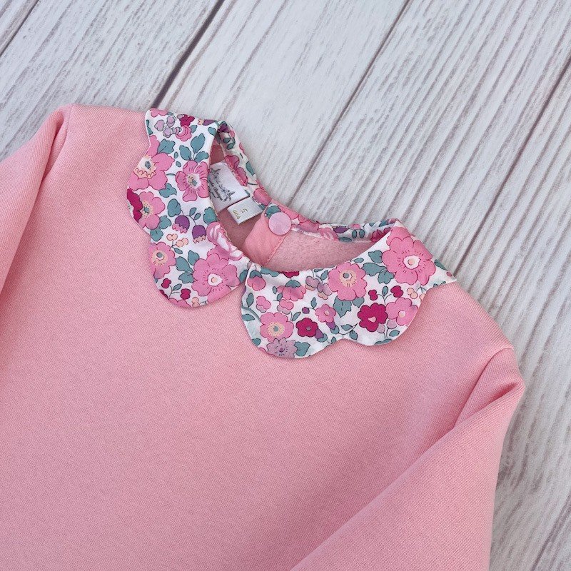 Sweat molletonné rose layette et liberty of London Betsy pétale irisé