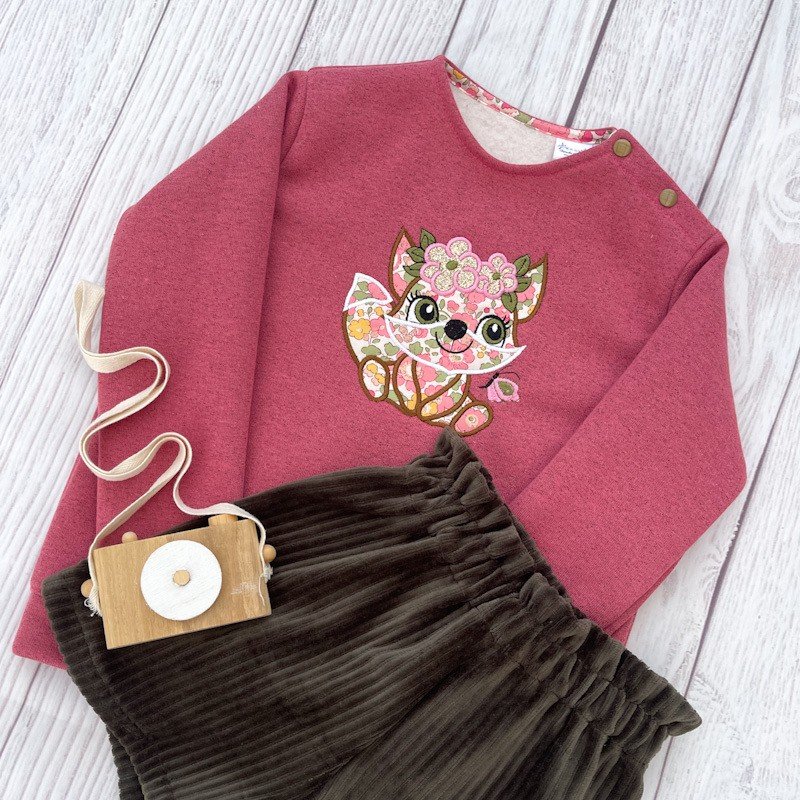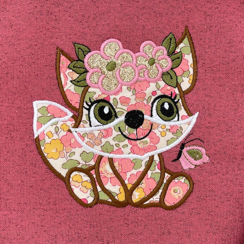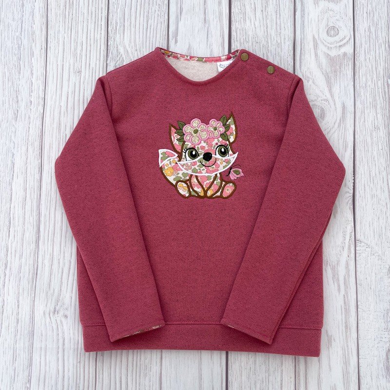 Sweat molletonné pailleté cuivre et liberty Betsy rose vanille glitter broderie Renard girly