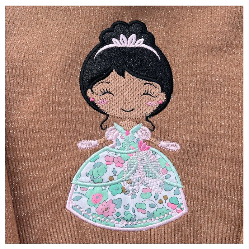Sweat molletonné pailleté noisette et liberty Betsy seafoam broderie Anna