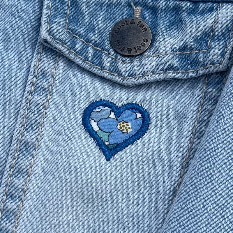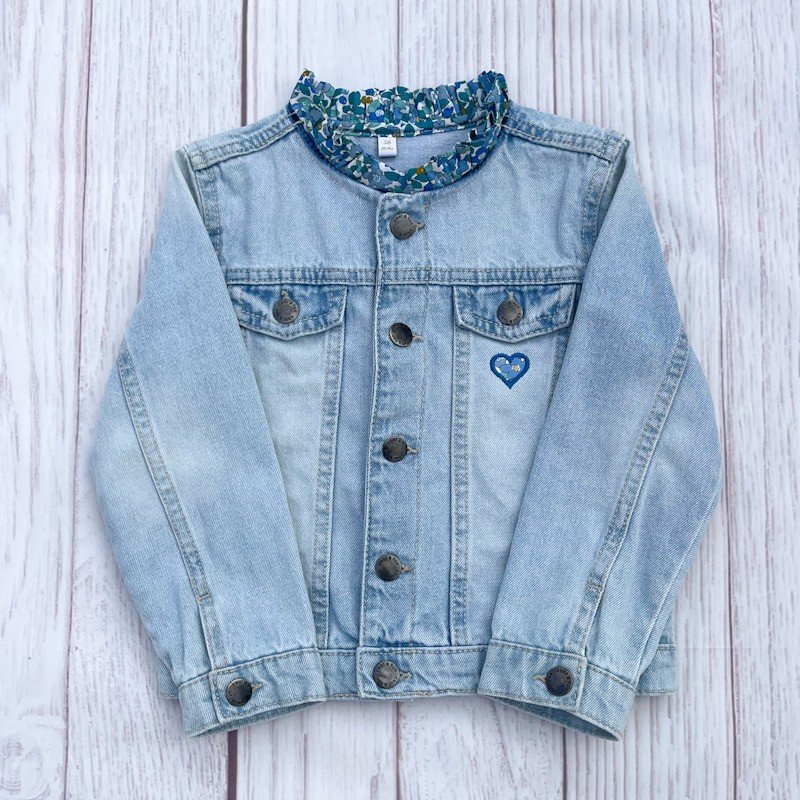 Ajout d'un col victorien en Liberty of London et broderie d'un coeur sur la poche avant