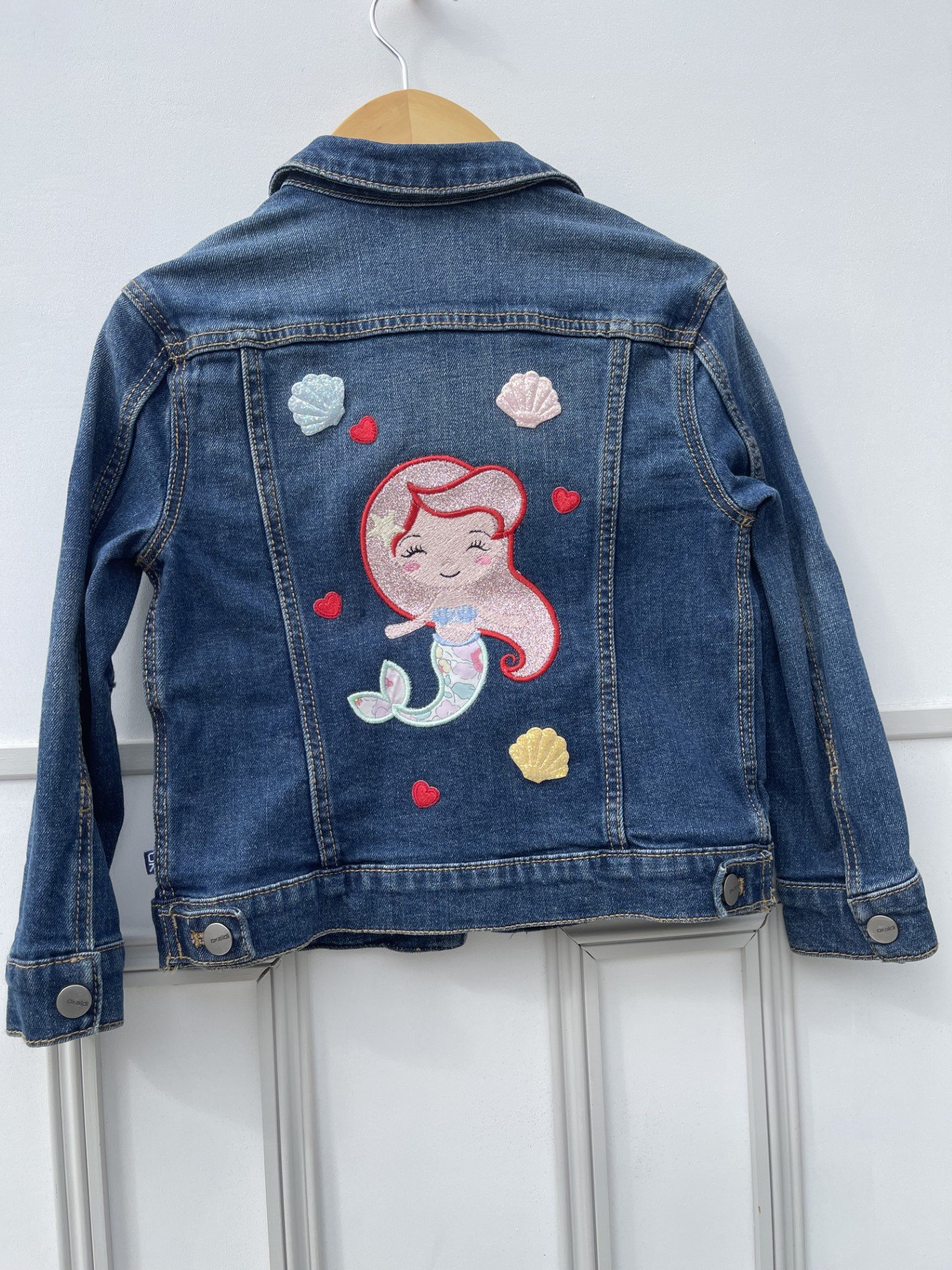 Veste Jean 2nde main marque Okaidi customisée avec broderie princesse Ariel et patchs coquillages