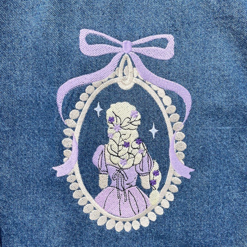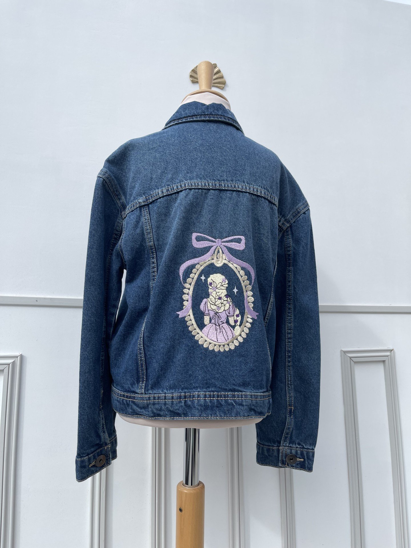 Veste Jean neuve marque Gemo customisée avec broderie princesse Raiponce dos